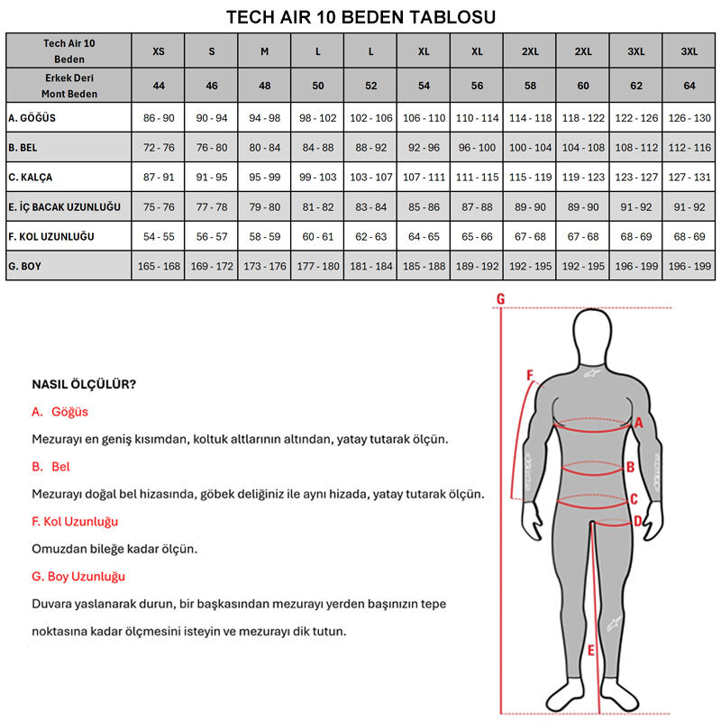 Tech-Air® 10, herhangi bir Alpinestars Tech-Air® Ready veya Tech-Air® Uyumlu deri elbisenin veya sürücünün göğüs çevresinde 4 cm, kalça çevresinde 2 cm boşluk bulunan herhangi bir üçüncü taraf deri montun altına giyilebilir. Bir çarpışma durumunda hava yastığının şişmesini karşılayabilmek için göğüs ve kalça için ilave alan gereklidir.