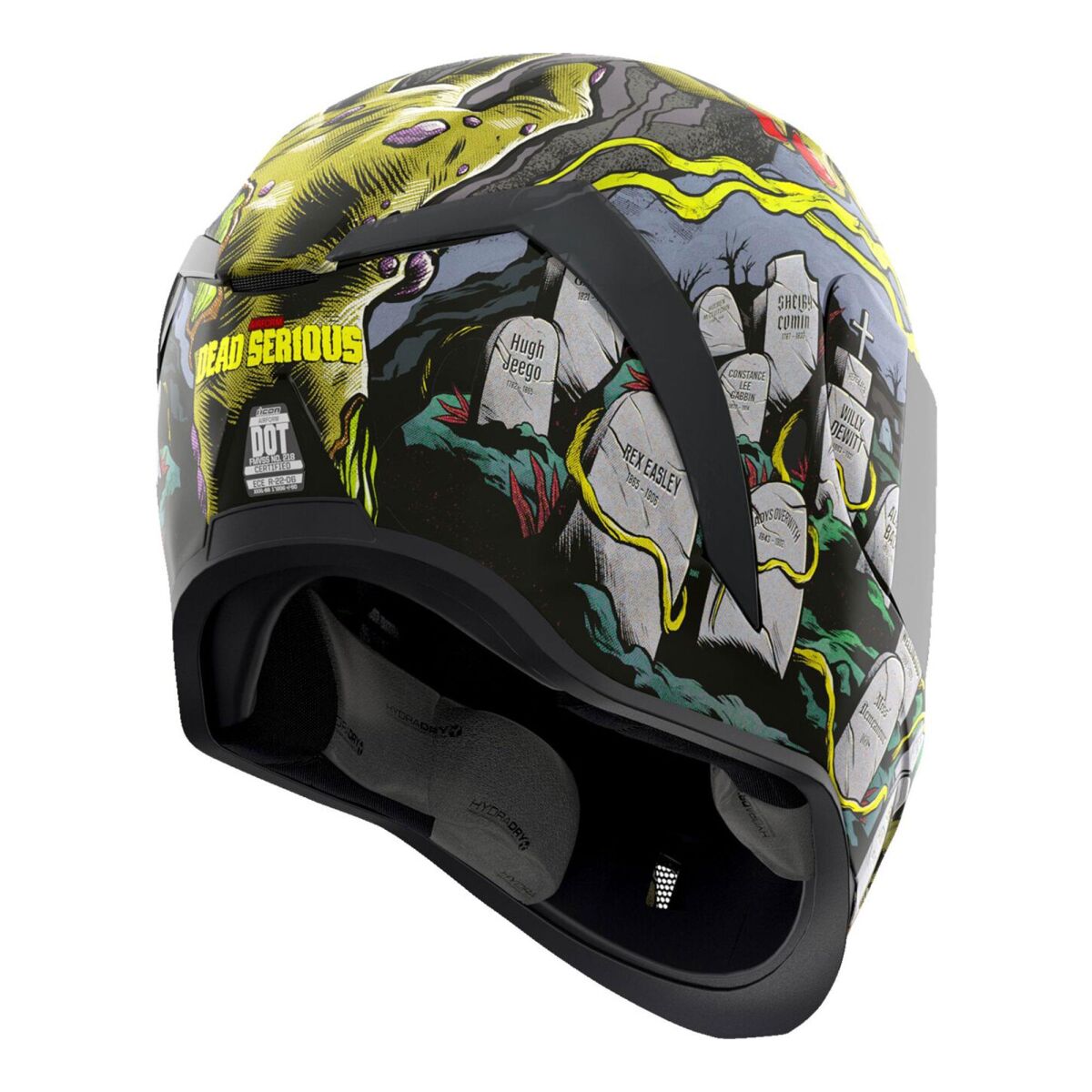 Dahili Dropshield™ güneş vizörü, güneş ışınlarına karşı koruma sağlar ve harici bir kumanda kolu ile kontrol edilir (yalnızca ana vizör kapalıyken kullanılabilir). Üç parçalı Hydradry™ iç ped, nem emici özellikte olup çıkarılabilir yapıdadır. Sürekli havalandırma sistemi ve özel şekillendirilmiş boyun dolgusu, uzun sürüşlerde konforu artırır. Kulaklık yuvaları, kaskın ICON R.A.U. Bluetooth sistemine uyumluluğunu sağlar. Çıkarılabilir nefes yönlendirici, bu detaylı özellikleri tamamlayarak tarz ve işlevselliği mükemmel bir şekilde birleştiren bir kask sunar.