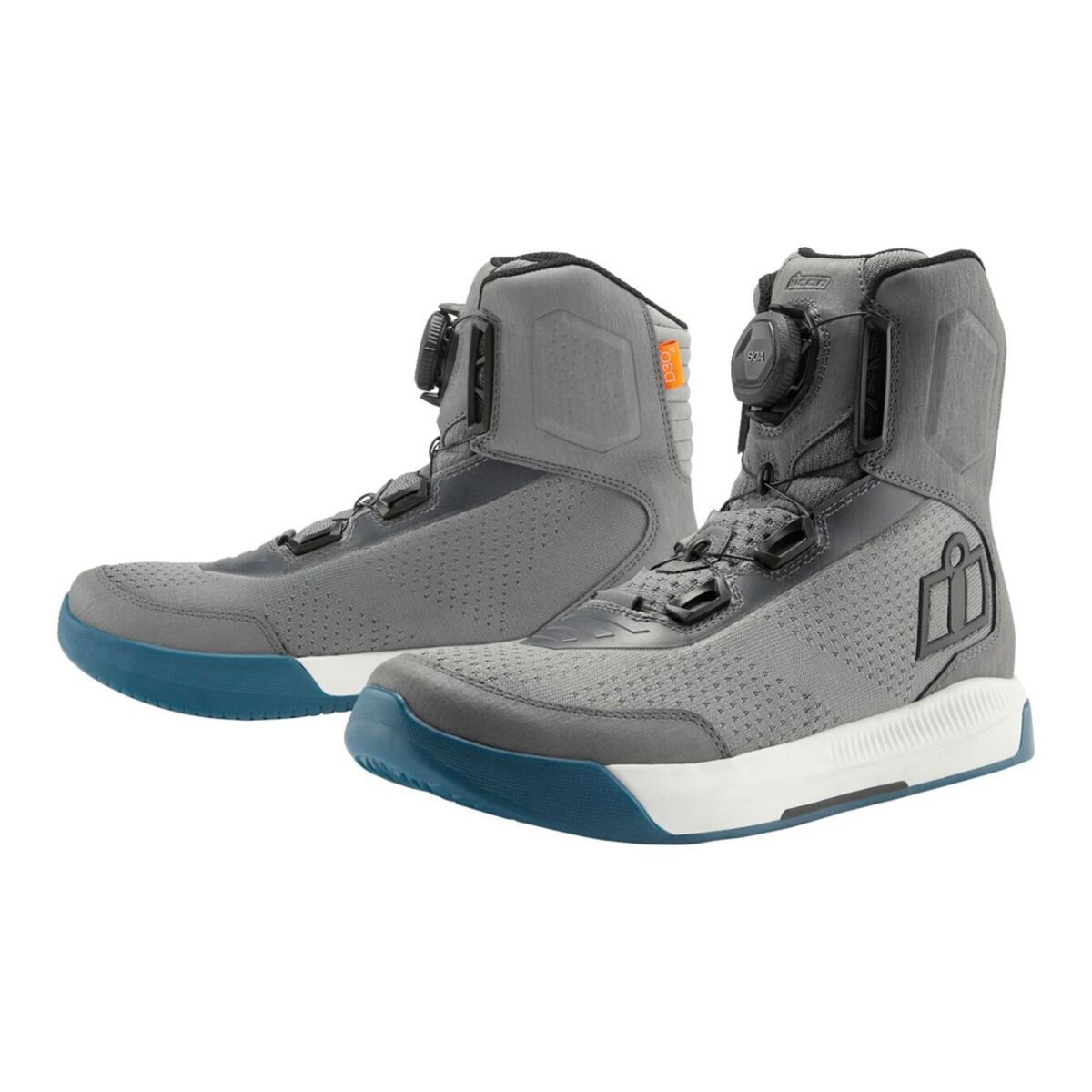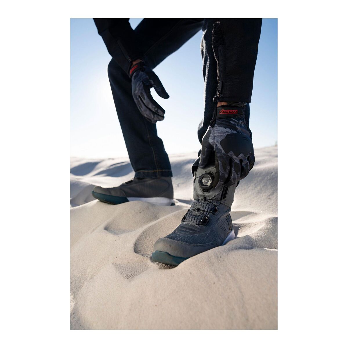 Sıcak hava koşullarına uygun geleceğin ayakkabıları ICON'dan! TechTuff kaplamalara sahip havalandırmalı tekstil üst yüzey, sıcaklık yükseldiğinde maksimum hava akışı ve dayanıklılık sağlar. BOA kapatma sistemi kolay giyilip çıkarılmasına olanak tanırken, iç kısımda bulunan D3O ayak bileği pedleri ekstra koruma sunar. Yüksek geri tepme özelliğine sahip köpük orta taban, sürüş konforunu artırırken, güçlendirilmiş orta ayak desteği ek yapı sağlar. Son olarak, premium kauçuk dış taban her koşulda kayma direncini artırır.