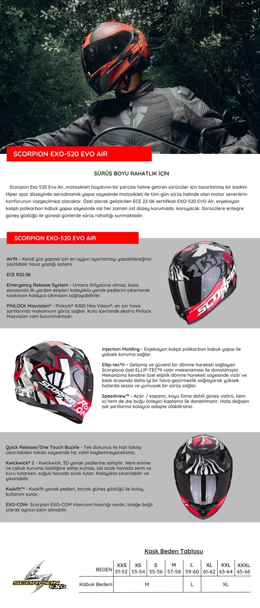 Hyper sportif bir aerodinamik düzey ile gün boyu sürüş konforunu bir araya getirmek üzere özel olarak tasarlanan, ECE sertifikalı EXO-520 EVO Air, aynı zamanda entegre bir güneş vizörünün rahatlığını da sunar.