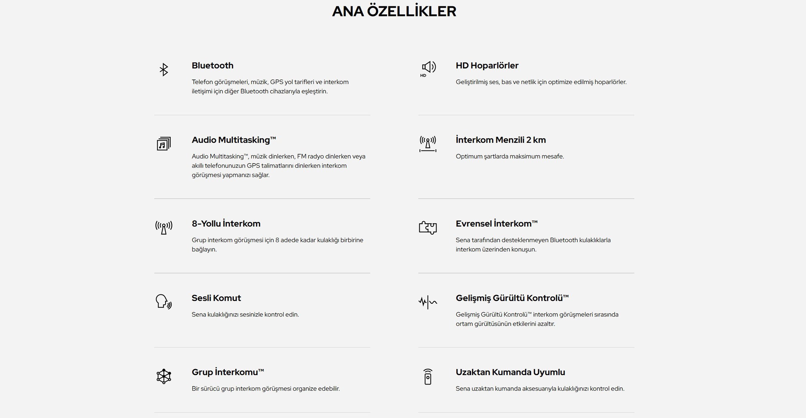 Üniversal İnterkom: Arkadaşlarınızın Sena ekipmanı olmasa bile, markası ne olursa olsun, ekipmanınızın onların ekipmanıyla çalışmasını sağlayan Universal Intercom™ protokolünü kullanır. Sena dışındaki diğer interkom cihazlarına bağlanabilirsiniz. (1 Bağlantı)