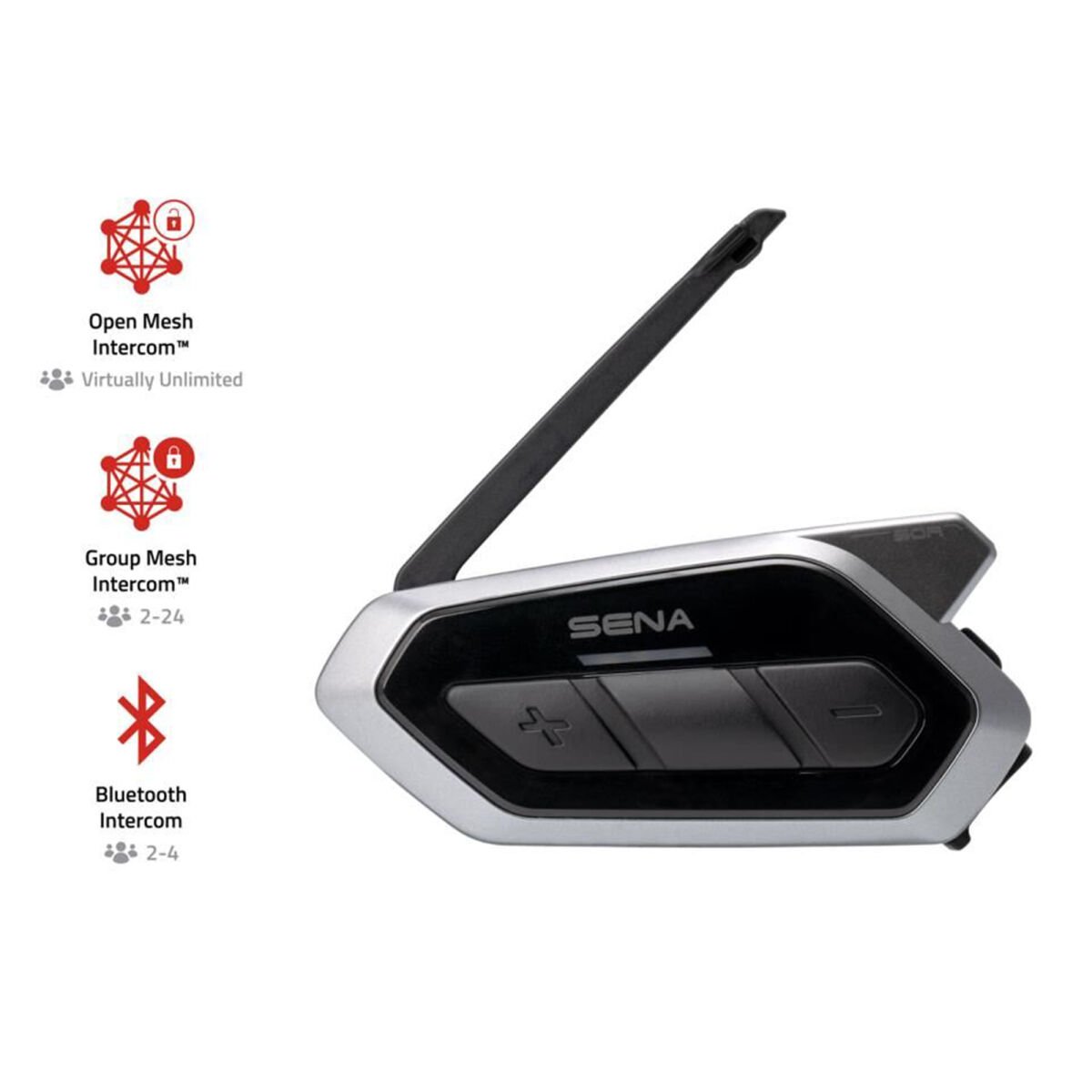 Bluetooth İnterkom, kullanıcıları sıralı bir şekilde eşleştiren, eşler arası bir iletişim ağıdır; interkom iletişimi kurulabilmesi için, öncesinde bir eşleştirme süreci gerektirir. Merkezi erişim noktalarına dayanan geleneksel ağların aksine, Mesh ağlar her bir düğümün (cihazın) bir röle görevi görerek birbirine bağlanmasını ve ağın kapsamını dinamik olarak genişletmesini sağlar. İletişimin bu merkezi olmayan yapısı, artırılmış güvenilirlik ve artırılmış kapsama alanı dahil olmak üzere çok sayıda avantaj sunar. Kısaca ifade edilecek olursa, Sena tarafından geliştirilen Mesh Intercom™ sınırsız sayıda kişiyle bağlantı kurulmasına olanak sağlayan bir iletişim ağıdır. Bir kullanıcı Mesh interkomu etkinleştirdiğinde, aynı Mesh ağındaki diğer yakındaki kullanıcılarla anında bağlantı kurar. Açık iletişim, diğer adıyla Open Mesh Intercom, çok kanallı bir protokole sahiptir ve kullanıcıların ayrı kanallardaki interkom kullanıcılarıyla iletişim kurmasına olanak tanır. Sena’nın Mesh teknolojisi, tüm Sena Mesh Intercom™ kullanıcıları için benzersiz bir interkom ses kalitesi, net, istikrarlı ve sağlam bağlantı sunar. Mesh üniteleri arasındaki zorlu ve çetin koşullar altında bile %80 daha fazla veri aktarılmasını sağlar.