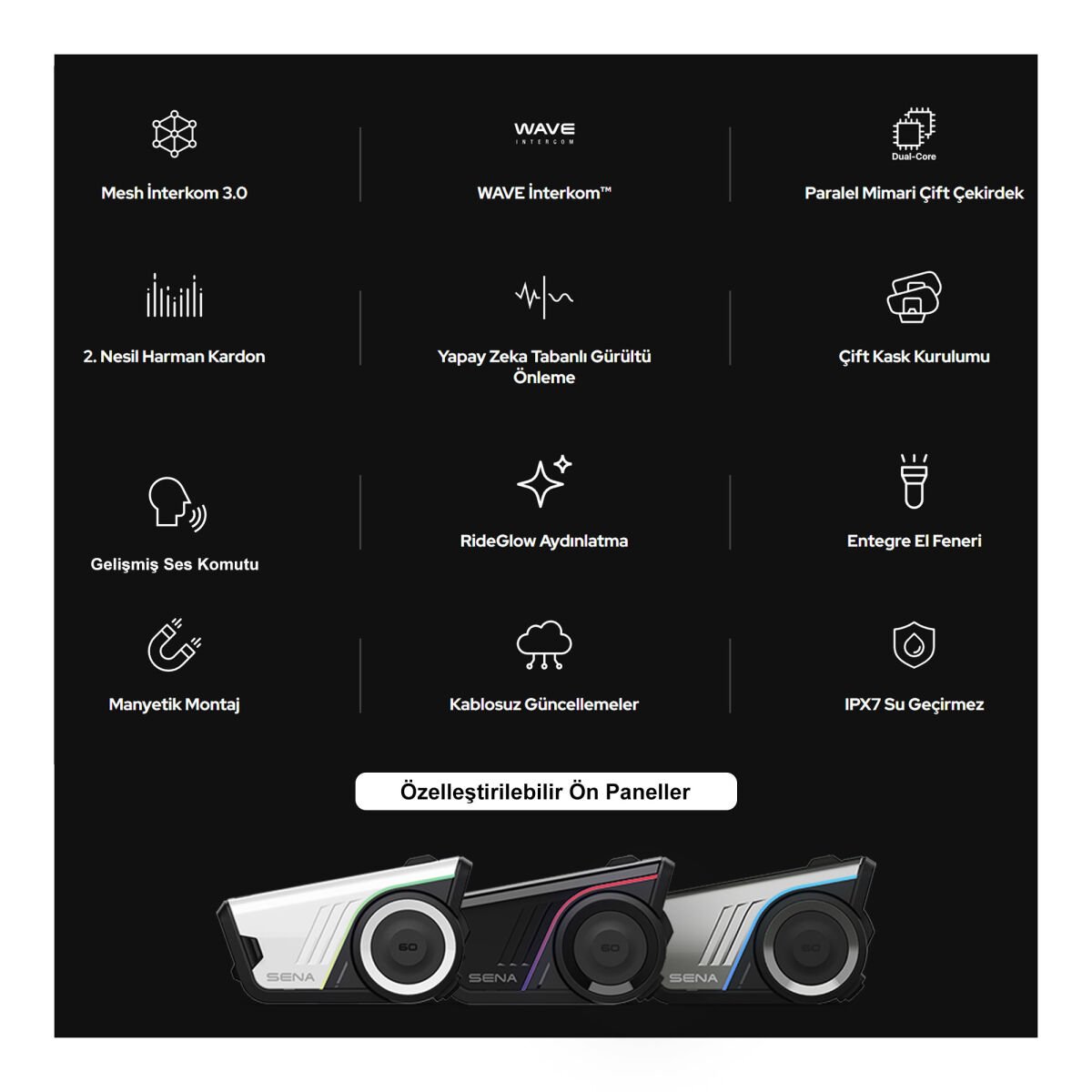 60S İnterkom, sınır tanımayan devrim niteliğindeki hücresel tabanlı grup iletişim sistemi Wave Intercom ile tam uyumluluk özelliğiyle en üst düzey motosiklet kulaklığı olarak yeni standardı belirliyor. Wave'i destekleyen en üst düzey Sena modeli olarak, zahmetsiz kontrol için basit bir düğme arayüzü ve Akıllı Wave-to-Mesh dönüşümü gibi eşsiz avantajlar sunuyor.