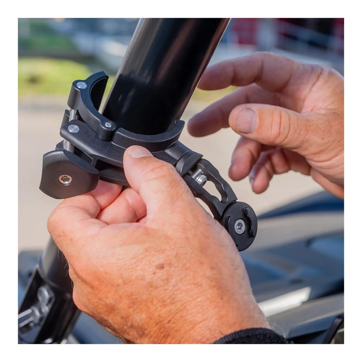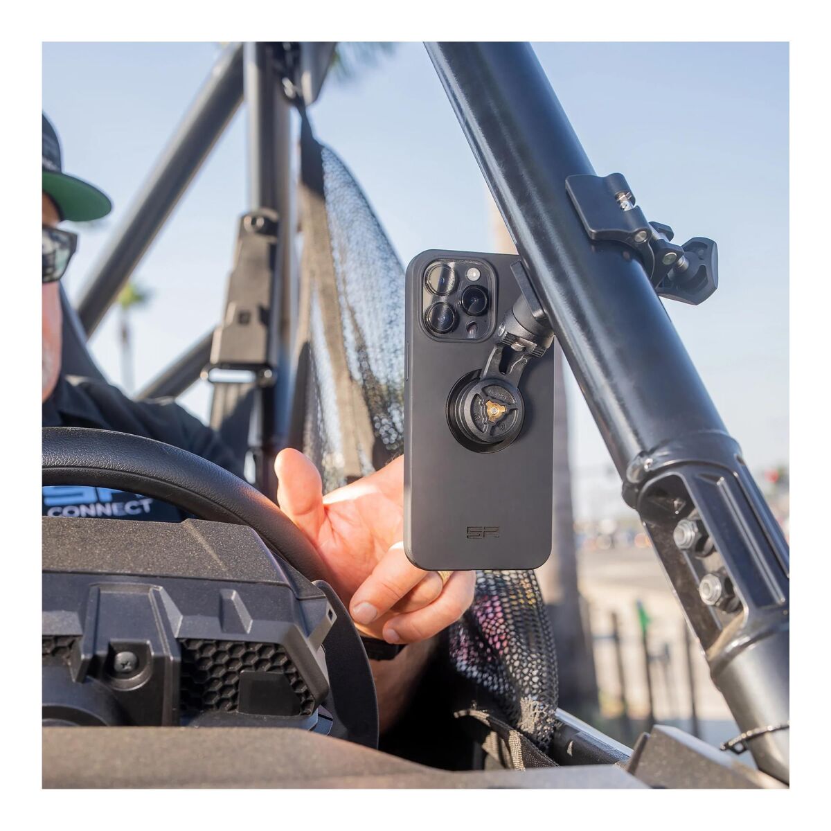 Rulo Kafes Montajı, SP ConnectTM Telefon Kılıfınıza mükemmel uyum sağlar. Artık arazide sürerken telefonunuzu düşürme veya kaybetme konusunda endişelenmenize gerek yok!