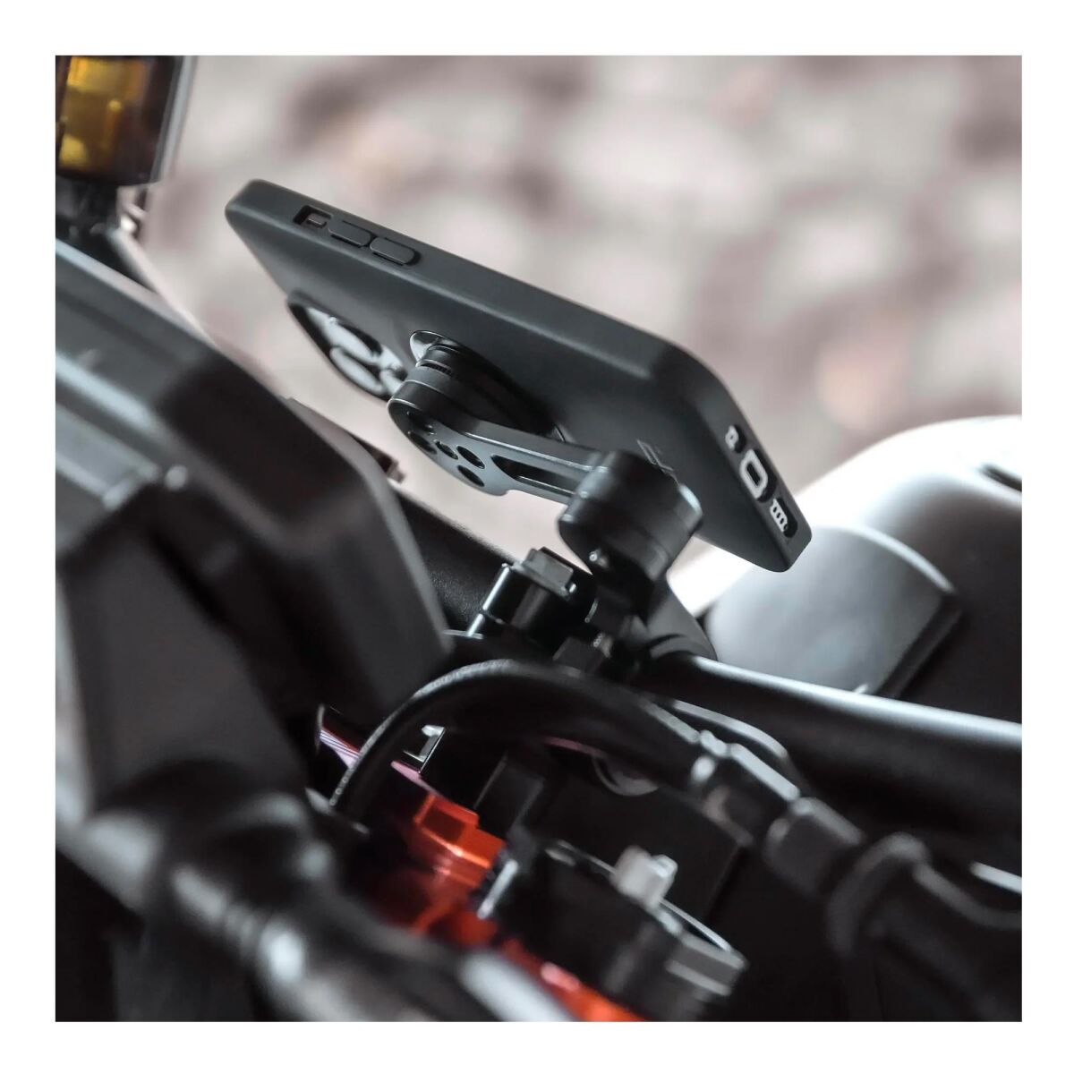 Moto Mount Pro; 2.22 / 2.54 / 2.86 / 3.17 cm veya 0.875 / 1.0 / 1.125 / 1.25 inç çapındaki standart ya da geniş gidonlara monte edilebilir ve 360° dönebilir yapısıyla esnek bir şekilde ayarlanabilir.<>Bu sayede akıllı telefonunuz görüş alanınızda en ideal konumda olur.